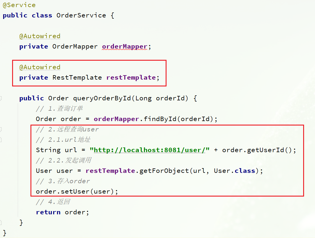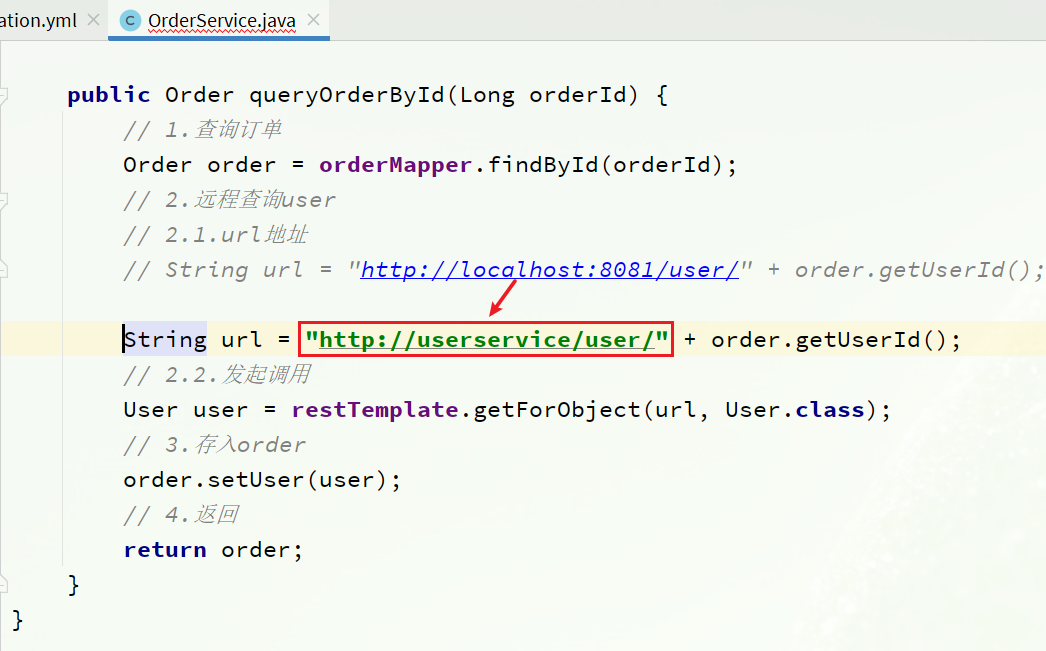• 修改order-service服务中的OrderService类中的queryOrderById方法,根据Order对象中的userId查询User