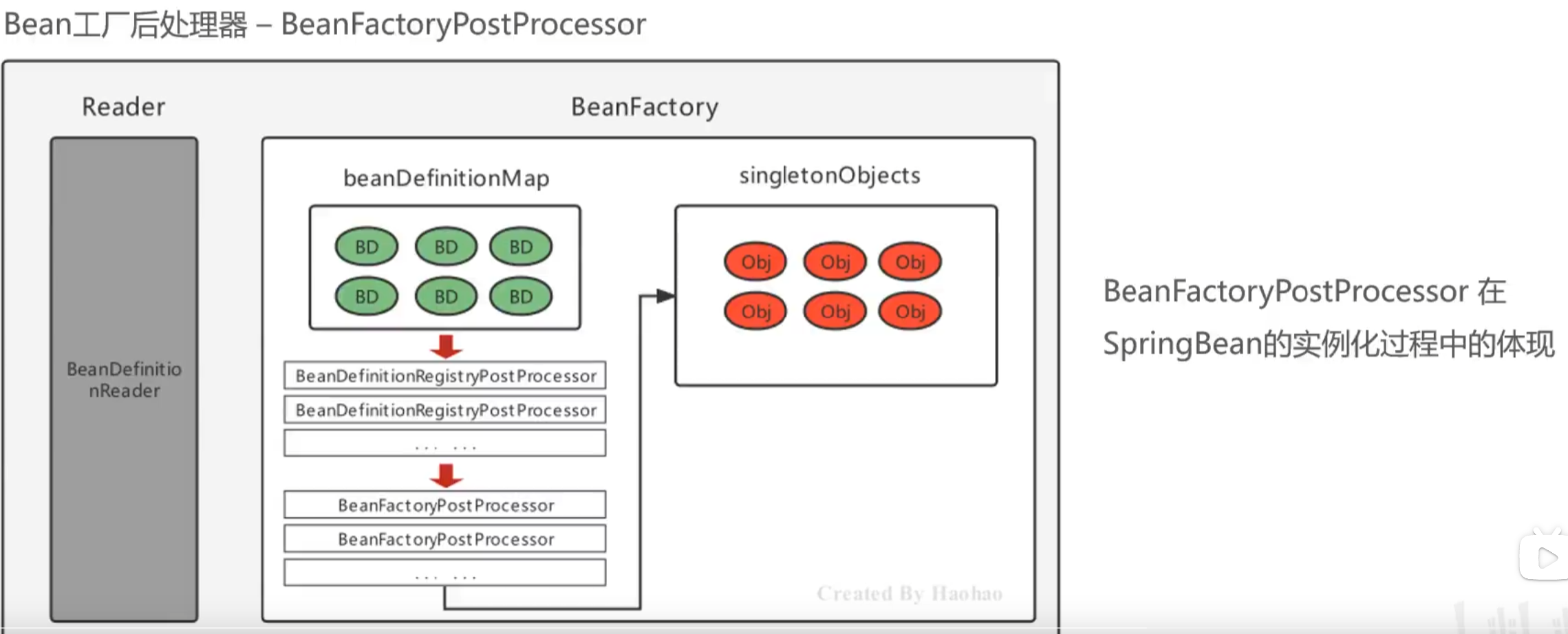 BeanFactoryPostProcessor:Bean工厂后处理器,在BeanDefinition填充完毕后,Bean实例化之前。